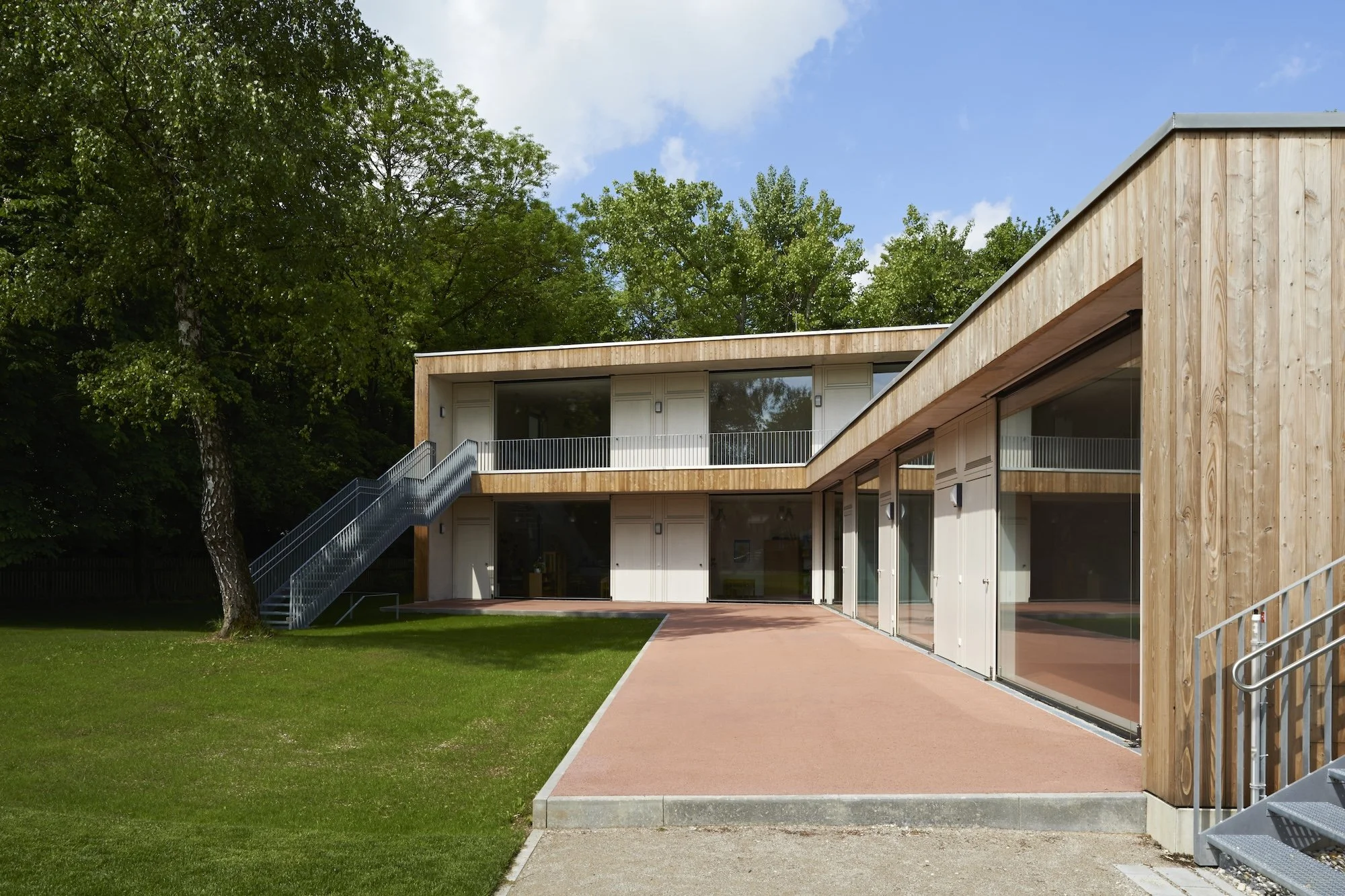 Bei dem Projekt handelt es sich um den Ersatzneubau eines 3-gruppigen Kindergartens für die Laudate Kirche in Garching. Städtebaulich schließt der Baukörper den Raum entlang des Lärmschutzwalls zur A9 nach Norden hin ab und bildet gleichsam einen Auftakt zur nördlichen Wohnbebauung.