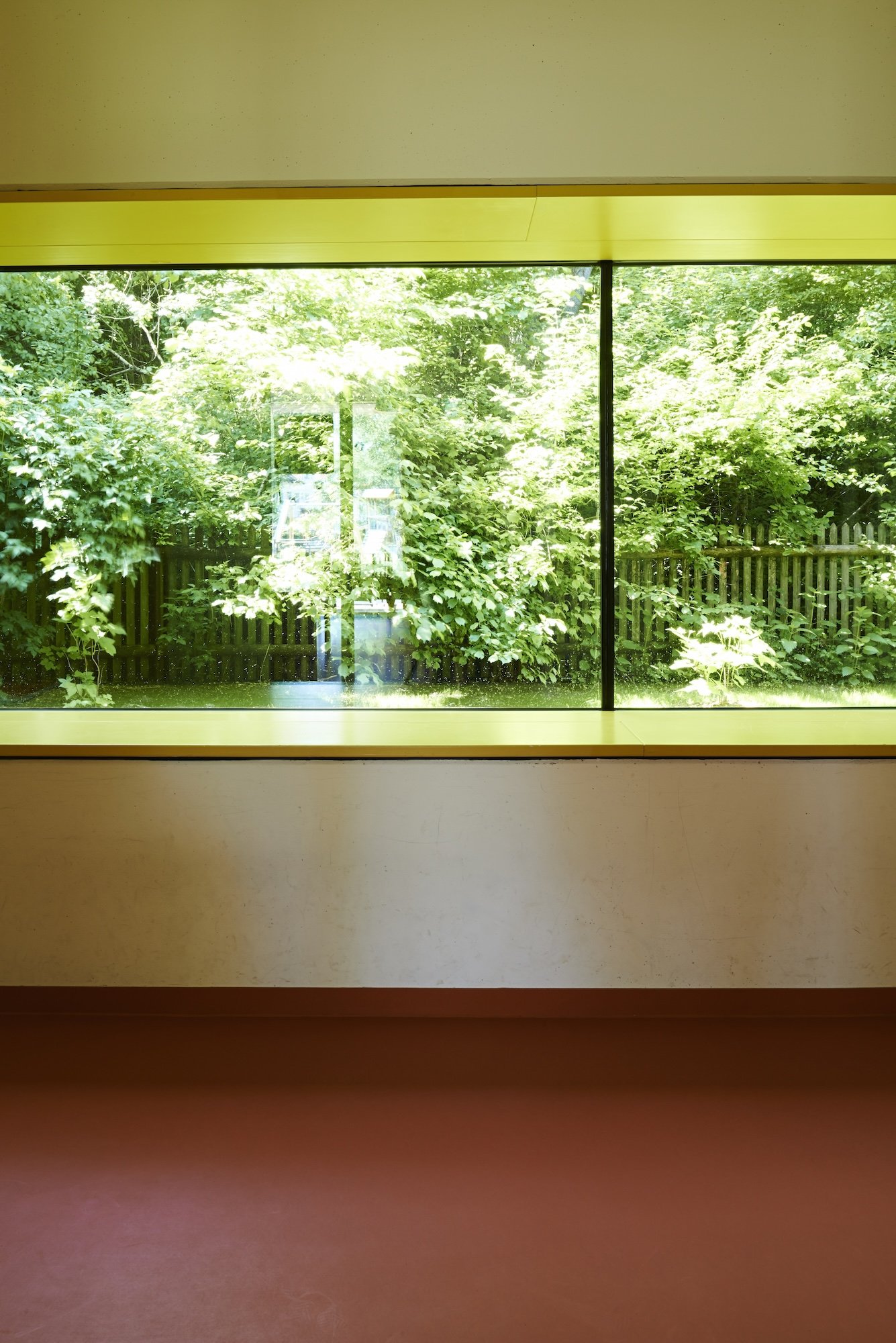 Die winkelförmige Aufweitung des Baukörpers unterstützt die Öffnung des Kindergartens zum Grünraum. Alle Gruppenräume orientieren sich nach Süden bzw. Osten und öffnen sich zum Garten, was durch eine vorgelagerte Terrasse unterstrichen wird. Der Mehrzweckraum, durch großzügige Türelemente um die Aula erweiterbar, formuliert die Mitte des Kindergartens. Farbige Sitzkästen strukturieren die Fassade und bieten im Inneren Raum zum Spielen und Verweilen. Die Garderoben werden zum raumbildenden Wandmöbel.