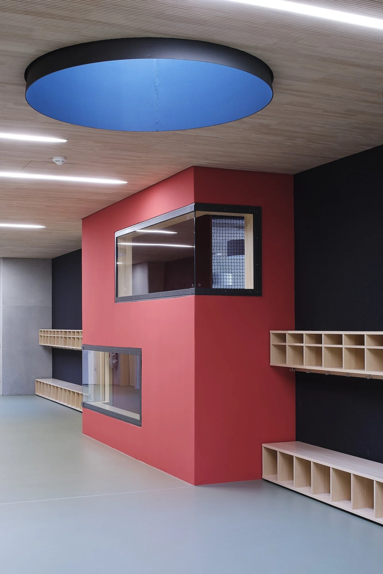 Wichtiger Bestandteil des baulichen Konzepts ist die allseitige Wahrnehmbarkeit und räumliche Erlebbarkeit des Gebäudes durch die Kinder. Sichtbeziehungen von den Spielnischen in den Spielflur sowie in die jeweiligen Gruppenräume, vom Flur durch die Oberlichter nach draußen in die Wolken und den Himmel, aber auch vom begrünten Dach, von oben in das Gebäude, sowie das Besteigen, Erklettern und Abrodeln des Walls lassen die Kinder das Gebäude ganzheitlich erleben und räumlich allseitig erfassen.