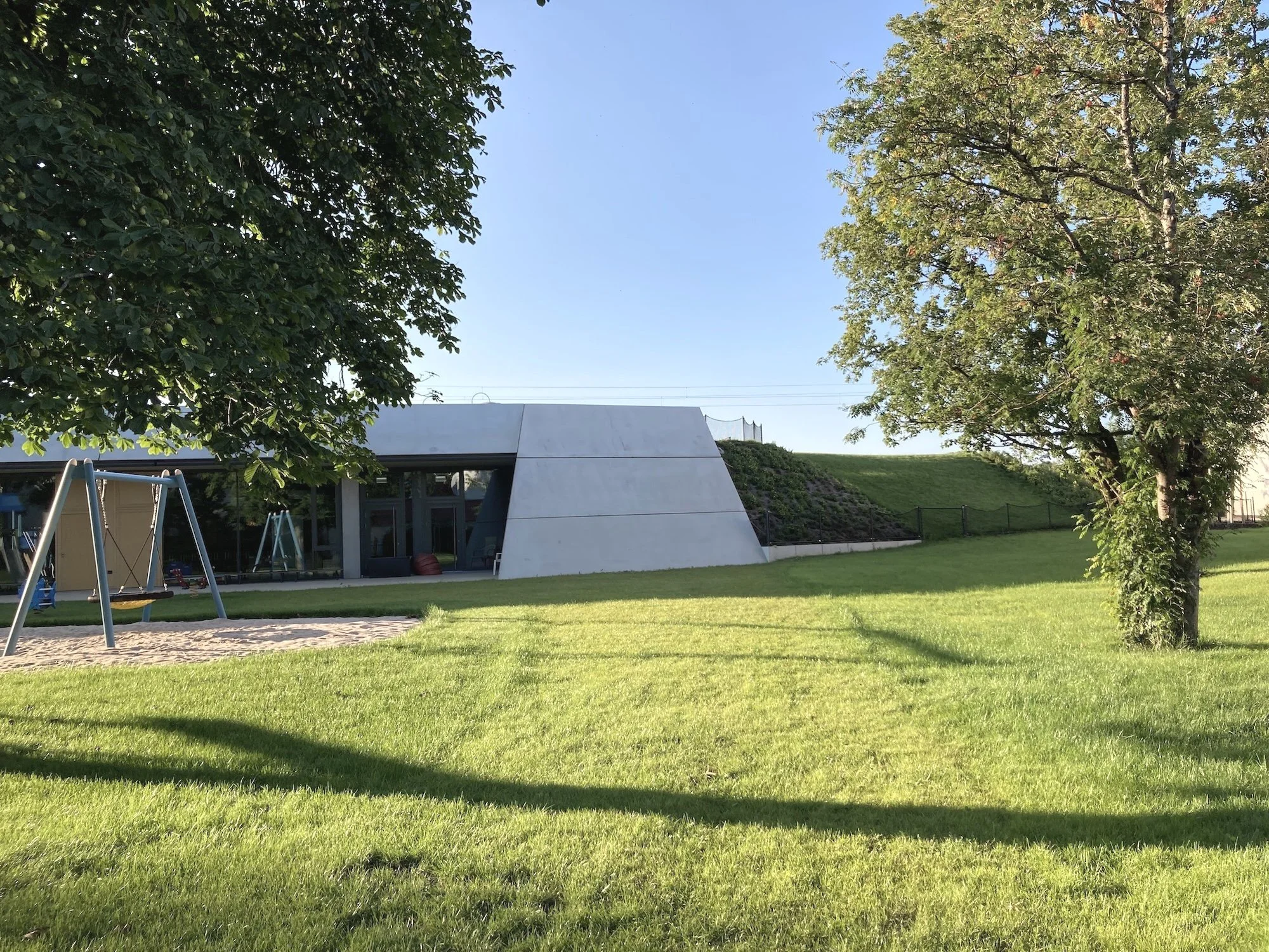 Der neue, in einen Lärmschutzwall integrierte Kindergarten positioniert sich an der nördlichen Grundstücksgrenze, parallel zur Bahnlinie. Die Organisation des Gebäudes erfolgt in möglichst konsequenter Umsetzung der sich aus den schalltechnischen Untersuchungen ergebenden Besonderheiten: sämtliche Gruppen- und Gruppennebenräume sowie der Mehrzweckraum orientieren sich ausschließlich zur schallgeschützten Südseite und somit zum Garten. Rücklings, im Bereich der Böschung des Lärmschutzwalls zur schallbelastenden Bahnlinie hin, sind die Sanitär-, Abstell-, Technik und sonstigen Nebenräume nahezu fensterlos angeordnet und bilden somit einen zusätzlichen, baulichen Immissionsschutz der Aufenthalts- und Spielbereiche. An der Westseite sind die Räume für die Mitarbeiter, das Leiterinnenbüro, der Personalraum sowie die Küche angeordnet. Im Osten bilden die Abstellräume für den Mehrzweckraum sowie die Außenspielgeräte den baulichen Abschluss. Die Aufenthaltsbereiche der Kinder werden auf diese Weise 3-seitig baulich arrondiert.