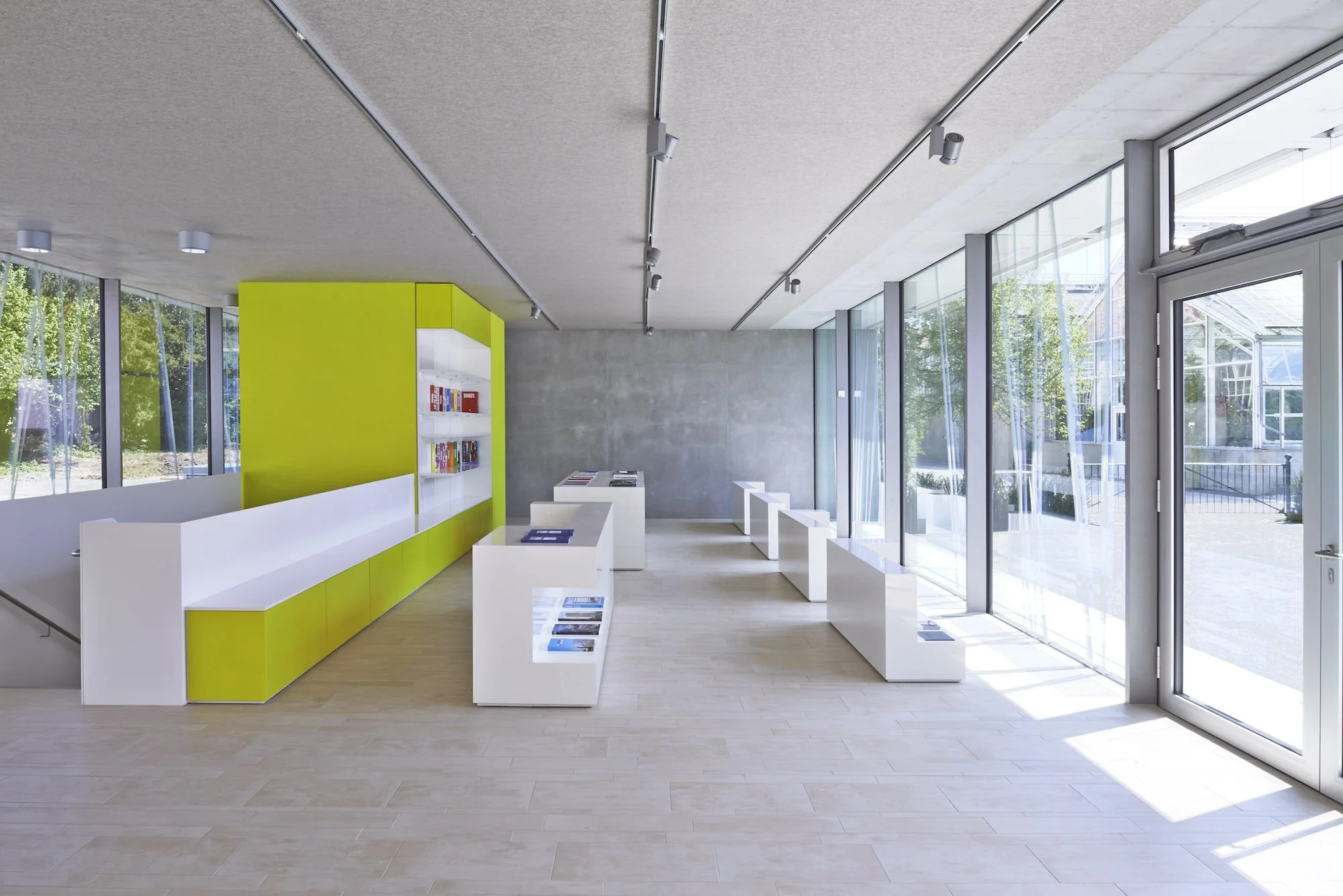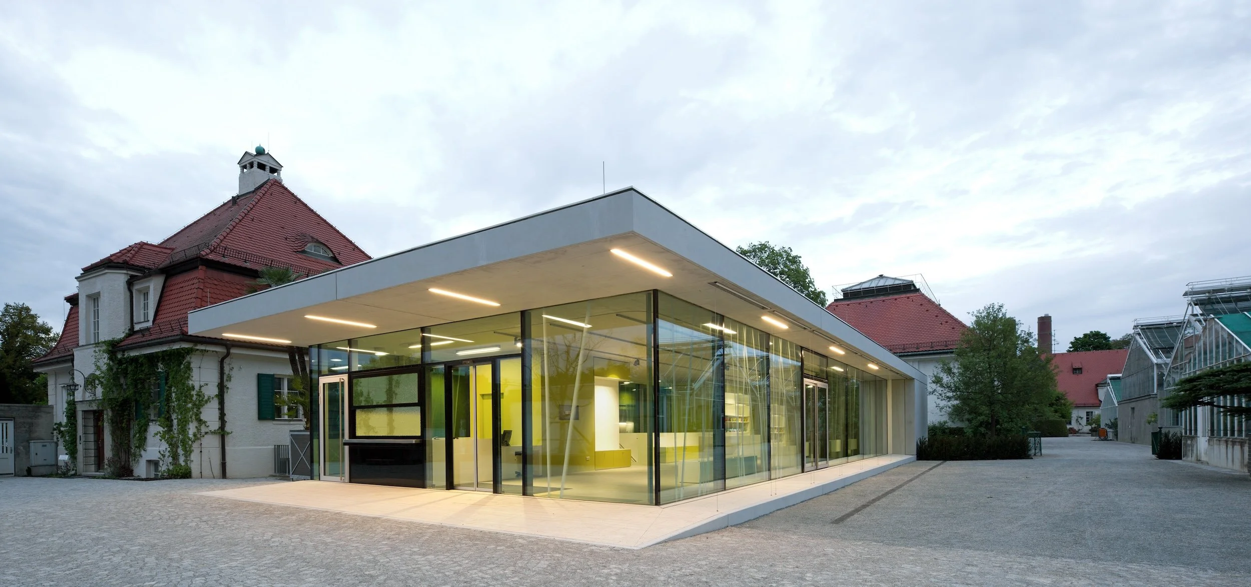 Bei dem Projekt handelt es sich um den Neubau eines Eingangspavillons mit Museumsshop für den Botanischen Garten in München. Der Entwurf sieht ein lichtdurchflutetes klar proportioniertes Gebäude im Stil der klassischen Moderne vor, welches sich mit Rücksicht auf den Bestand in Höhe und Maßstäblichkeit behutsam in die Umgebung einfügt. Durch seine transparente Fassadengestaltung nimmt sich der Bau zurück. In der Fassade spiegelt sich der Bestand wieder.
