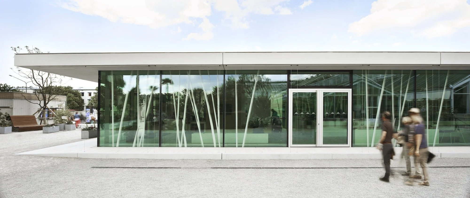 Die Glasscheiben sind mit Motiven aus dem Botanischen Garten bedruckt, welche im Innenraum ein je nach Lichteinfall wechselndes Schattenspiel erzeugen. Die einladende Gebäudehülle zieht den Besucher ins Innere. Umlaufende Vordächer definieren die Eingänge und dienen gleichzeitig dem Wetterschutz. Im Erdgeschoss befinden sich der Informations- und Kassenbereich, der Museumsladen sowie der Vorbereitungsbereich für Veranstaltungen in der benachbarten Winterhalle. Im Untergeschoss wurden die Schließfächer, die Toiletten, sowie die Hauptlagerflächen vorgesehen.