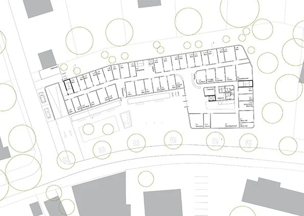 Durch die räumliche Gliederung und Positionierung des Neuen Rathauses entsteht ein städtebauliches Ensemble aus Rathaus, evangelischer und katholischer Kirche sowie den angrenzenden Bebauungen und Freibereichen. Die Ortsmitte von Gröbenzell wird gestärkt und das neue Rathaus mit seinem Vorplatz bildet die verbindende Mitte. Der großzügige Rathausvorplatz lädt ein zum Verweilen und Eintreten in das Rathaus mit seinem vielseitigen Angebot. Dem städtebaulichen Gesamtkonzept folgt die Organisation des Rathauses im Inneren. Über den Rathausplatz erfolgt die Haupterschließung. Von hier aus gelangt man in das helle, einladende Foyer mit Empfangsbereich und zentraler Verteilerfunktion. Eine schnelle Orientierung ist gegeben. Im Erdgeschoss befindet sich der Bereich Bürgerservice sowie die Gemeinschaftsräume. Die weiteren Abteilungen sind in den oberen Geschossen angeordnet und werden über einen zentralen Lichthof erschlossen. Dieser Lichthof schafft visuelle Sichtbeziehung zwischen den Geschossen und dient zur angenehmen Belichtung der inneren Zone des Rathauses mit natürlichem Tageslicht. In allen Ebenen gliedern helle, offene Erschließungs- und Wartebereiche den Grundriss.