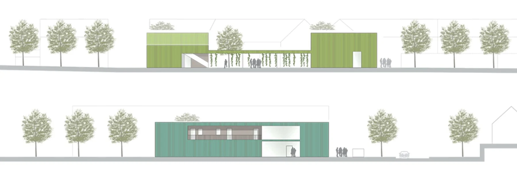 Der Entwurf sieht einen ein- bis zweigeschossigen u-förmigen Baukörper vor, welcher sich zum grünen Band hin öffnet. Über einen zentralen Haupteingang mit Foyer werden Kinderkrippe, Kindergarten und Hort erschlossen. Das Gebäude vereint die einzelnen Funktionsbereiche für die Kinder um einen zentralen Innenhof. Jede Altersgruppe hat ihren eigenen klar definierten Freibereich. Das Foyer öffnet sich über die gesamte Breite zum Innenhof. Der Übergang von innen nach außen ist fließend und die Räume vielfältig für Veranstaltungen je nach Wetterlage nutzbar. Im Erdgeschoss befinden sich Kinderkrippe und Kindergarten. Im Obergeschoss sind der Hort sowie die Wohnungen angeordnet. Alle Gruppenräume sowie die Aufenthaltsräume der Wohnungen orientieren sich nach Süden. Der Neubau fügt sich ein, steht aber doch eigenständig und öffnet sich einladend für die Kinder und Bewohner. Als Konstruktionssowie Fassadenmaterial wurde Holz gewählt, welches eine angenehme Atmosphäre erzeugt und hinsichtlich Nachhaltigkeit sowie CO2-Bilanz der beste Baustoff ist. Durch den Fassadenaufbau entsteht je nach Standpunkt des Betrachters ein Zusammenspiel aus vertikaler Holzlattung und dahinterliegender farbiger Schicht.