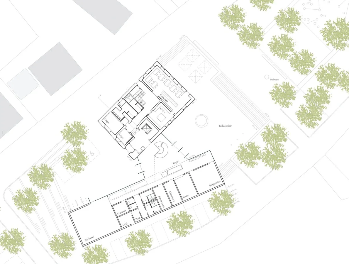 Das Ensemble aus Alt und Neu öffnet sich zu den angrenzenden Freibereichen und empfängt über das helle und einladende Foyer die Besucherinnen und Besucher. Das zentrale Foyer bildet die Mitte beider Gebäude und ermöglicht schnelle Orientierung. Alle Nutzungsbereiche sind klar gegliedert und über helle, einladende Erschließungsflächen verbunden.