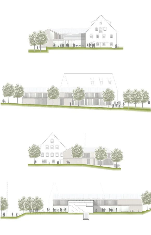 Durch das städtebauliche Gesamtkonzept entsteht ein Ensemble aus Altbau und Neubau, welches die zentrale Mitte im Ort definiert. Die gewählte bauliche Ergänzung schafft eine klare räumliche Gliederung der Gesamtanlage in Plätze und Freibereiche unterschiedlicher Größe und Nutzungen. Mit Rücksicht auf den historisch bedeutsamen Bestand nimmt sich der Neubau in der Höhe sowie in der Materialwahl zurück, die Traufhöhe sowie Dachneigung sind niedriger, Holz ist hier das gestaltgebende Material. Ein von zwei Seiten lichtdurchfluteter Mittelbau verbindet zwischen Altbau und Neubau, hier befindet sich das Foyer von dem aus alle Ebenen erreicht werden können.