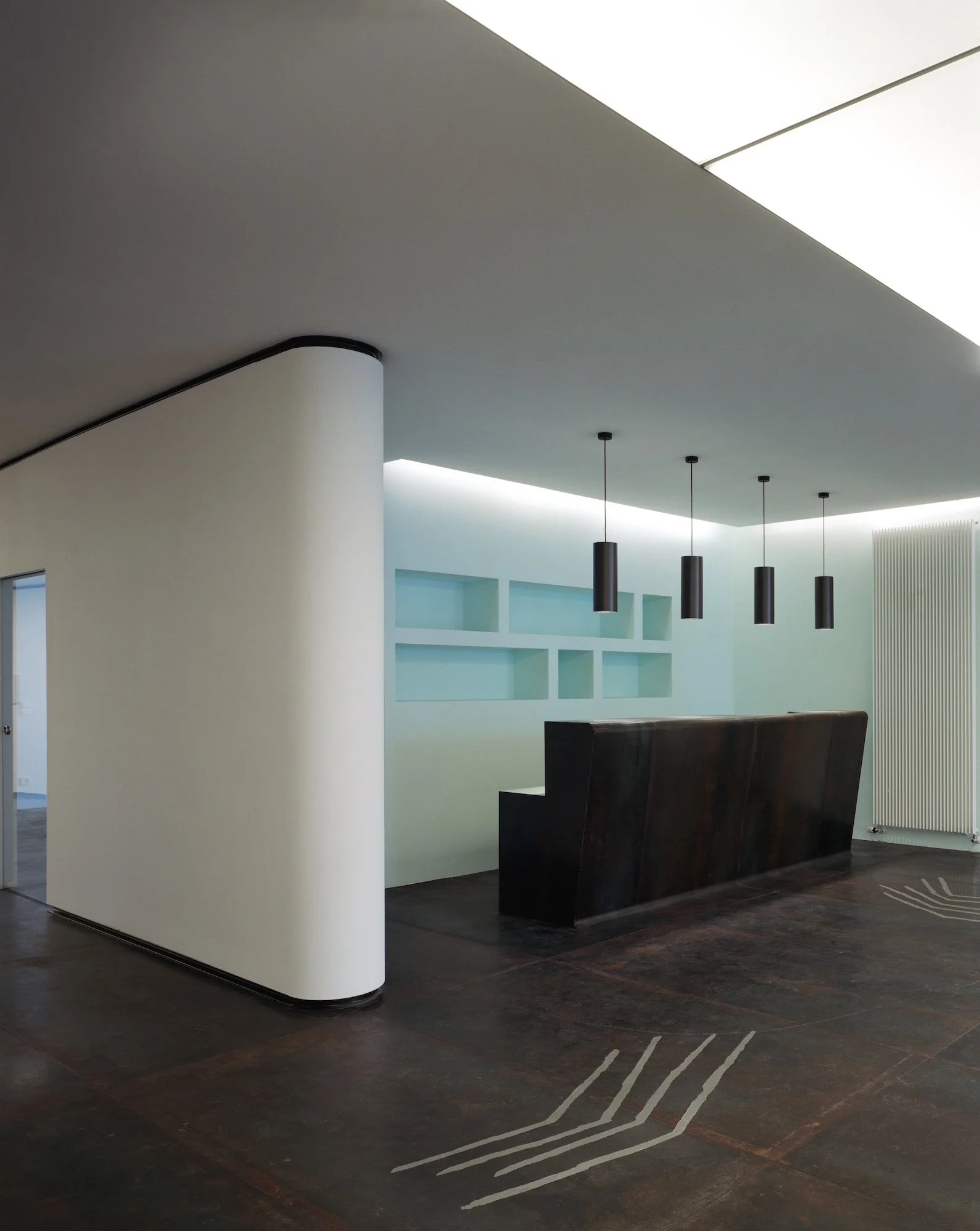 Der raumbildende Ausbau vereint nun Büroräume für ein Projektentwicklungs- und Immobilienbüro sowie einen Multifunktionsraum für Präsentationen und Kunstausstellungen. Das Konzept der bandartigen Ausstellungswand ordnet und definiert die unterschiedlichen Funktionsbereiche, umschließt den Ausstellungsbereich und verbindet zugleich die ehemals unstrukturierte Raumabfolge zu einem einheitlichen Raumkontinuum. Die Exponate können sich im Raum entfalten, Kunst und Architektur werden eins.