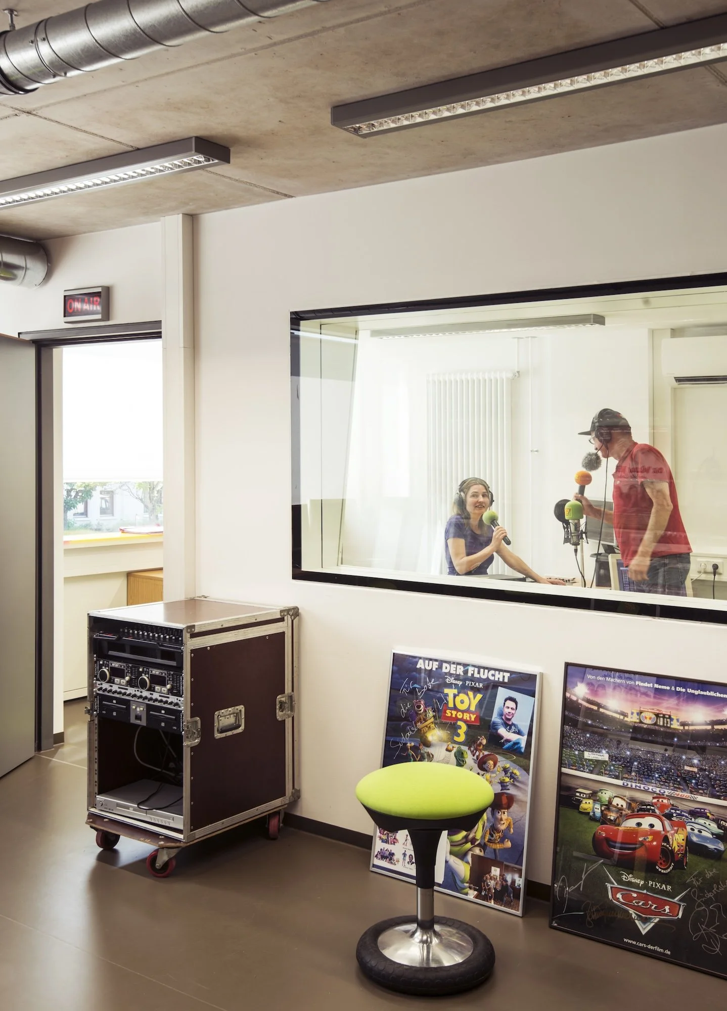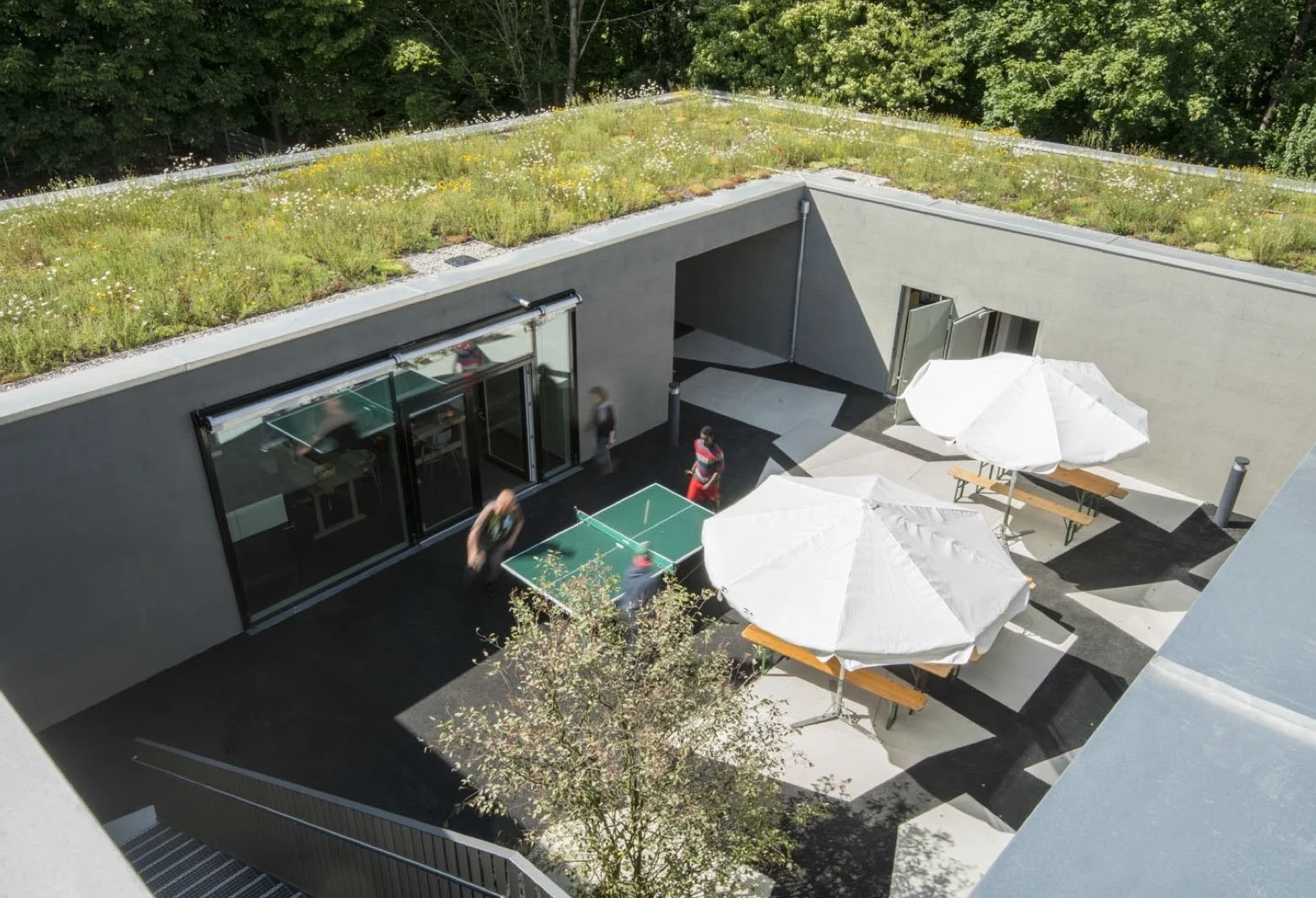 Die Höhenentwicklung des Baukörpers, mit einer Zweigeschossigkeit zu den beiden angrenzenden Straßenseiten hin, sorgt für den erforderlichen Schallemissionsschutz zur umliegenden Wohnbebauung. Mit Bezugnahme auf die öffentlichen Grünflächen nimmt sich das Gebäude durch die gewählte Eingeschossigkeit angenehm zurück und fügt sich behutsam ein.